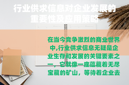 在当今竞争激烈的商业世界中,行业供求信息无疑是企业生存和发展的关键要素之一,它就像一座蕴藏着无尽宝藏的矿山,等待着企业去挖掘和利用,为企业的决策制定、市场拓展以及战略规划提供有力的支持。
