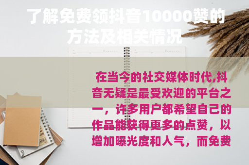 在当今的社交媒体时代,抖音无疑是最受欢迎的平台之一,许多用户都希望自己的作品能获得更多的点赞,以增加曝光度和人气,而免费领抖音10000赞的话题也因此备受关注。
