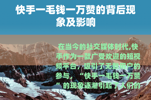 在当今的社交媒体时代,快手作为一款广受欢迎的短视频平台,吸引了无数用户的参与。“快手一毛钱一万赞”的现象逐渐引起了人们的关注。