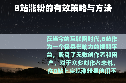 在当今的互联网时代,B站作为一个极具影响力的视频平台,吸引了无数创作者和用户,对于众多创作者来说,在B站上实现涨粉是他们不断追求的目标,如何在B站有效地涨粉呢? 质量是关键,创作者需要投入足够的时间和精力去制作高质量、有价值的视频内容,这意味着要精心策划视频主题,确保其具有独特性和吸引力,能够在众多视频中脱颖而出,可以选择一些热门但尚未被充分挖掘的领域,或者以新颖的视角来呈现常见的话题。