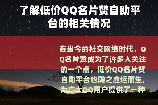 在当今的社交网络时代,QQ名片赞成为了许多人关注的一个点,低价QQ名片赞自助平台也随之应运而生,为广大QQ用户提供了一种获取名片赞的便捷途径。