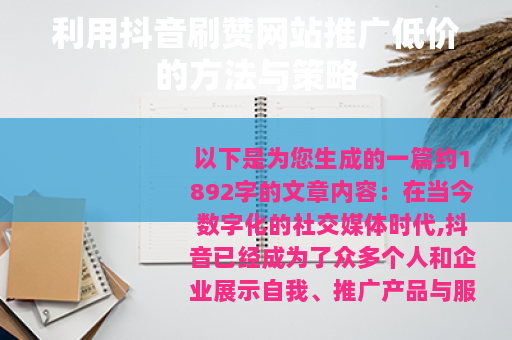在当今数字化的社交媒体时代,抖音已经成为了众多个人和企业展示自我、推广产品与服务的重要平台,随着竞争的日益激烈,如何在抖音上获得更多的点赞和关注成为了许多人关注的焦点,而抖音刷赞网站推广低价这一现象也随之兴起,为用户提供了一种看似便捷且成本较低的提升抖音影响力的途径。