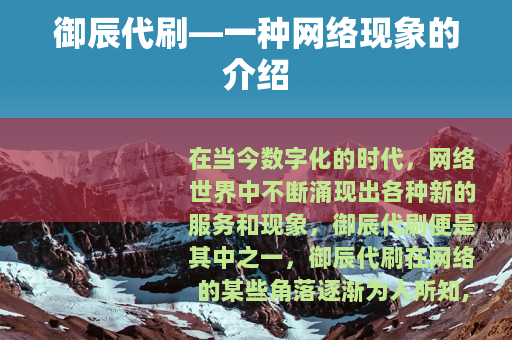 在当今数字化的时代,网络世界中不断涌现出各种新的服务和现象,御辰代刷便是其中之一,御辰代刷在网络的某些角落逐渐为人所知,它以一种独特的方式在虚拟空间中占据了一席之地。