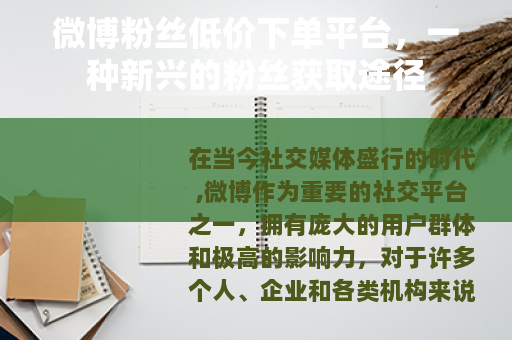 在当今社交媒体盛行的时代,微博作为重要的社交平台之一,拥有庞大的用户群体和极高的影响力,对于许多个人、企业和各类机构来说,微博粉丝的数量在一定程度上代表着其在网络世界的热度和影响力,微博粉丝低价下单平台应运而生。