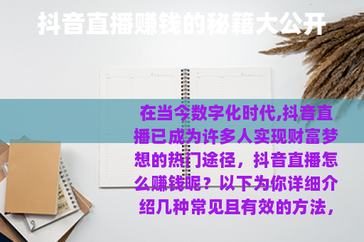 在当今数字化时代,抖音直播已成为许多人实现财富梦想的热门途径,抖音直播怎么赚钱呢?以下为你详细介绍几种常见且有效的方法。