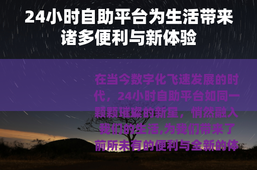 24小时自助平台作为数字化时代的产物,已经成为我们生活中不可或缺的一部分,它以其便捷、高效、个性化的特点,为我们的生活带来了诸多便利与新体验,让我们的生活变得更加丰富多彩,我们应该积极拥抱这一趋势,充分利用这些平台的优势,同时也要注意解决可能出现的问题,让24小时自助平台更好地服务于我们的生活和社会发展,随着科技的不断进步,相信24小时自助平台将会不断完善和创新,为我们带来更多的惊喜和价值。