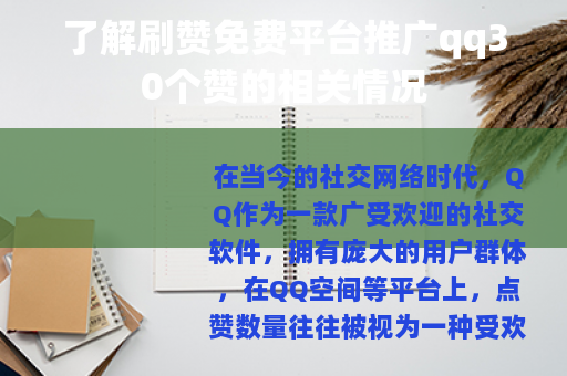 在当今的社交网络时代,QQ作为一款广受欢迎的社交软件,拥有庞大的用户群体,在QQ空间等平台上,点赞数量往往被视为一种受欢迎程度的体现,刷赞免费平台推广qq30个赞这样的服务便应运而生。