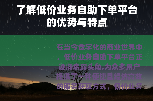 低价业务自助下单平台在当今的商业环境中具有重要的价值和意义,它以低价、高效、便捷的特点,为用户和供应商搭建了一个互利共赢的桥梁,为商业活动的开展提供了新的思路和模式,随着技术的不断发展和市场的进一步成熟,相信这类平台将会发挥更大的作用,为经济的发展和社会的进步做出更大的贡献,我们可以期待低价业务自助下单平台在服务质量、业务种类和用户体验等方面不断优化和提升,为用户带来更多的便利和价值,供应商也将在平台的助力下,不断创新和发展,共同开创一个更加繁荣的商业新局面。