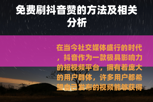 在当今社交媒体盛行的时代,抖音作为一款极具影响力的短视频平台,拥有着庞大的用户群体,许多用户都希望自己发布的视频能够获得更多的赞,以增加曝光度和人气,而免费刷抖音赞也成为了一些人关注的话题。