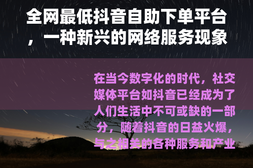 在当今数字化的时代,社交媒体平台如抖音已经成为了人们生活中不可或缺的一部分,随着抖音的日益火爆,与之相关的各种服务和产业也应运而生,其中就包括所谓的全网最低抖音自助下单平台。