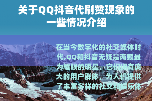 在当今数字化的社交媒体时代,QQ和抖音无疑是两颗最为耀眼的明星,它们拥有庞大的用户群体,为人们提供了丰富多样的社交和娱乐体验,而在这其中,QQ抖音代刷赞的现象也悄然兴起,成为了一个值得关注的话题。