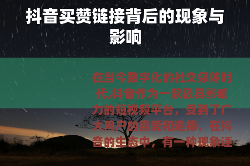 在当今数字化的社交媒体时代,抖音作为一款极具影响力的短视频平台,受到了广大用户的喜爱和追捧,在抖音的生态中,有一种现象逐渐引起了人们的关注,那就是抖音买赞链接的存在。
