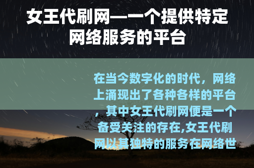 在当今数字化的时代,网络上涌现出了各种各样的平台,其中女王代刷网便是一个备受关注的存在,女王代刷网以其独特的服务在网络世界中占据了一席之地。