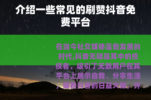 在当今社交媒体蓬勃发展的时代,抖音无疑是其中的佼佼者,吸引了无数用户在其平台上展示自我、分享生活,随着抖音的日益火爆,许多人都希望自己发布的视频能获得更多的点赞,从而提高曝光度和人气,刷赞抖音免费平台便应运而生,成为了不少人关注的焦点。