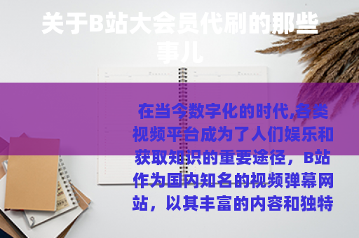 在当今数字化的时代,各类视频平台成为了人们娱乐和获取知识的重要途径,B站作为国内知名的视频弹幕网站,以其丰富的内容和独特的社区氛围吸引了大量用户,B站大会员拥有众多特权,如观看专属视频、享受高帧率画质等,这使得一些用户对成为大会员有着较高的需求,市场上出现的所谓“b站大会员代刷”服务,却引发了一系列值得关注的问题。