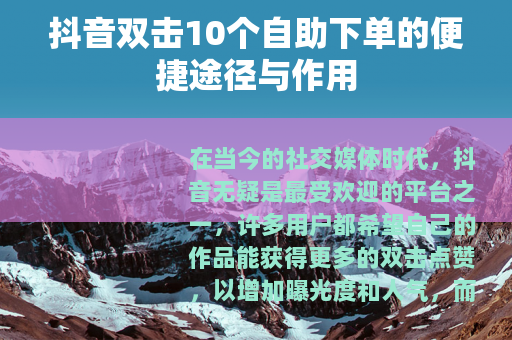 在当今的社交媒体时代,抖音无疑是最受欢迎的平台之一,许多用户都希望自己的作品能获得更多的双击点赞,以增加曝光度和人气,而抖音双击10个自助下单服务便应运而生,为用户提供了一种独特的助力方式。