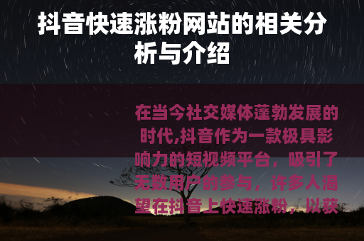 在当今社交媒体蓬勃发展的时代,抖音作为一款极具影响力的短视频平台,吸引了无数用户的参与,许多人渴望在抖音上快速涨粉,以获得更多的关注和机会,而抖音快速涨粉网站也随之应运而生。