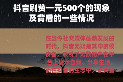在当今社交媒体蓬勃发展的时代,抖音无疑是其中的佼佼者,吸引了无数用户在平台上展示自我、分享生活,而在抖音的生态中,点赞量成为了衡量一个视频受欢迎程度的重要指标之一,一种所谓“抖音刷赞一元500个”的现象逐渐进入了人们的视野。