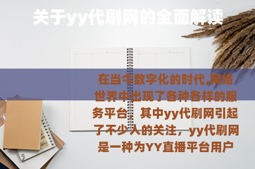 在当今数字化的时代,网络世界中出现了各种各样的服务平台,其中yy代刷网引起了不少人的关注,yy代刷网是一种为YY直播平台用户提供虚拟数据刷量服务的网络平台,它在一定程度上满足了部分用户对于提升直播数据的需求。