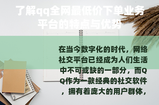 在当今数字化的时代,网络社交平台已经成为人们生活中不可或缺的一部分,而QQ作为一款经典的社交软件,拥有着庞大的用户群体,随着互联网的发展,各种与之相关的业务平台也应运而生,其中就包括qq全网最低价下单业务平台。