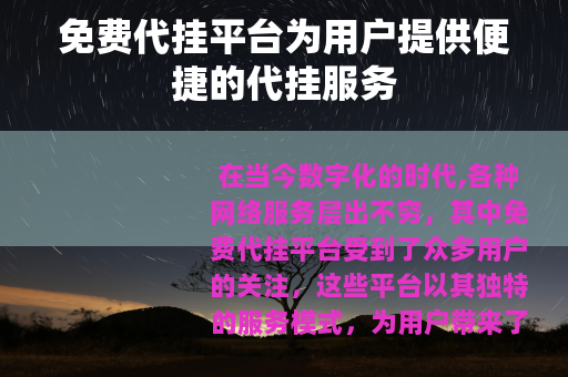 在当今数字化的时代,各种网络服务层出不穷,其中免费代挂平台受到了众多用户的关注,这些平台以其独特的服务模式,为用户带来了诸多便利,在网络世界中占据了一席之地。