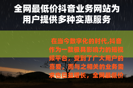 在当今数字化的时代,抖音作为一款极具影响力的短视频平台,受到了广大用户的喜爱,而与之相关的业务需求也日益增长,全网最低价抖音业务网站便应运而生,为众多抖音用户带来了诸多便利和实惠。