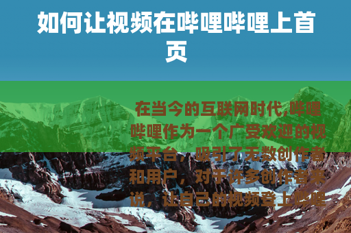 在当今的互联网时代,哔哩哔哩作为一个广受欢迎的视频平台,吸引了无数创作者和用户,对于许多创作者来说,让自己的视频登上哔哩哔哩的首页是一个极具吸引力的目标,因为这意味着更多的曝光、流量和粉丝增长,怎样才能实现这个目标呢? 质量是关键,要制作出高质量、有吸引力的视频内容,这包括有一个清晰明确的主题,能够准确地传达你想要表达的信息或情感,无论是搞笑、知识科普、美食制作还是游戏攻略等各种类型的视频,都要确保内容有深度、有趣味,能够让观众在观看后有所收获或感到愉悦。