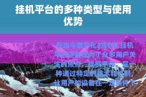 在当今数字化的时代,挂机平台逐渐成为了众多用户关注的焦点,挂机平台,是一种通过特定的技术和机制,让用户的设备在一定条件下自动运行特定任务,从而实现各种目的的平台。
