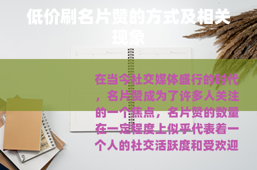 在当今社交媒体盛行的时代,名片赞成为了许多人关注的一个焦点,名片赞的数量在一定程度上似乎代表着一个人的社交活跃度和受欢迎程度,而低价刷名片赞的现象也随之悄然兴起,成为了一个值得探讨的话题。