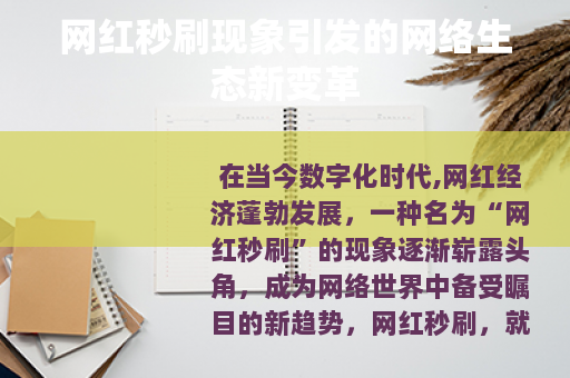 在当今数字化时代,网红经济蓬勃发展,一种名为“网红秒刷”的现象逐渐崭露头角,成为网络世界中备受瞩目的新趋势,网红秒刷,就是通过特定的技术手段或平台机制,在短时间内迅速提升网红的相关数据,如点赞数、评论数、粉丝量等。