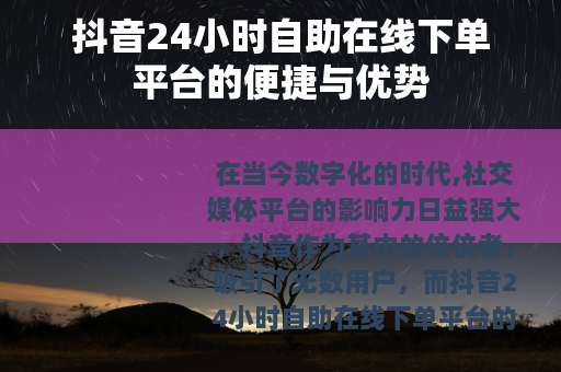 在当今数字化的时代,社交媒体平台的影响力日益强大,抖音作为其中的佼佼者,吸引了无数用户,而抖音24小时自助在线下单平台的出现,更是为用户带来了全新的体验和诸多便利。