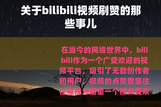 在当今的网络世界中,bilibili作为一个广受欢迎的视频平台,吸引了无数创作者和用户,视频的点赞数量往往被视为衡量一个视频受欢迎程度的重要指标之一,在追求高点赞量的过程中,出现了一种现象,那就是bilibili视频刷赞。