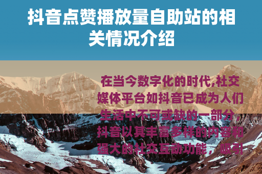 在当今数字化的时代,社交媒体平台如抖音已成为人们生活中不可或缺的一部分,抖音以其丰富多样的内容和强大的社交互动功能,吸引了数以亿计的用户,而在抖音的生态中,点赞和播放量是衡量一个视频受欢迎程度的重要指标,抖音点赞播放量自助站应运而生。