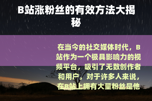 在当今的社交媒体时代,B站作为一个极具影响力的视频平台,吸引了无数创作者和用户,对于许多人来说,在B站上拥有大量粉丝是他们的梦想,因为这不仅意味着自己的作品得到了更多人的认可,还可能带来各种机会和收益,如何在B站上有效地涨粉丝呢? 质量是关键,要制作出优质、有吸引力的视频内容,这需要你深入了解自己的目标受众,明确他们的兴趣和需求,如果你擅长游戏,那么制作精彩的游戏攻略、搞笑的游戏实况等视频可能会吸引大量游戏爱好者关注,在视频制作过程中,要注重画面质量,确保清晰、流畅,同时声音也要清晰可听,视频的剪辑也非常重要,通过合理的剪辑可以让视频节奏更加紧凑,吸引观众的注意力并保持他们的观看兴趣。