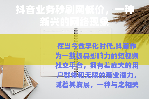 在当今数字化时代,抖音作为一款极具影响力的短视频社交平台,拥有着庞大的用户群体和无限的商业潜力,随着其发展,一种与之相关的现象——抖音业务秒刷网低价逐渐兴起,吸引了众多用户的关注。