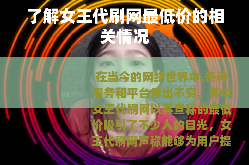 在当今的网络世界中,各种服务和平台层出不穷,其中女王代刷网以其宣称的最低价吸引了不少人的目光,女王代刷网声称能够为用户提供一系列的代刷服务,包括但不限于社交平台的点赞、评论、粉丝增长,以及一些视频平台的播放量等。