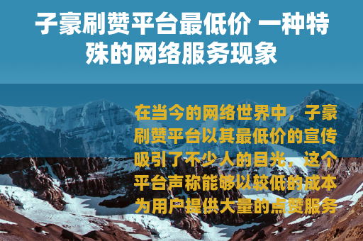 在当今的网络世界中,子豪刷赞平台以其最低价的宣传吸引了不少人的目光,这个平台声称能够以较低的成本为用户提供大量的点赞服务,从而帮助用户在各种社交平台或网络内容上获得更高的关注度和人气。