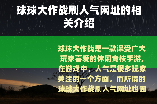 球球大作战是一款深受广大玩家喜爱的休闲竞技手游,在游戏中,人气是很多玩家关注的一个方面,而所谓的球球大作战刷人气网址也因此受到了一些玩家的关注。