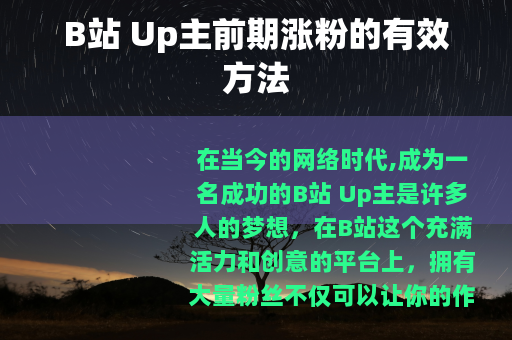 在当今的网络时代,成为一名成功的B站 Up主是许多人的梦想,在B站这个充满活力和创意的平台上,拥有大量粉丝不仅可以让你的作品得到更广泛的传播,还能为你带来各种机会和收益,对于B站的新手Up主来说,在前期如何有效地涨粉呢?以下是一些实用的方法。