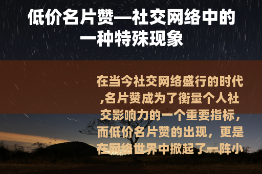 在当今社交网络盛行的时代,名片赞成为了衡量个人社交影响力的一个重要指标,而低价名片赞的出现,更是在网络世界中掀起了一阵小小的波澜。