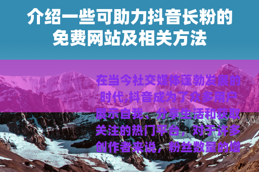 在当今社交媒体蓬勃发展的时代,抖音成为了众多用户展示自我、分享生活和获取关注的热门平台,对于许多创作者来说,粉丝数量的增长是他们不断努力的目标之一,而借助一些合适的免费网站,有可能为抖音长粉带来一定的助力。