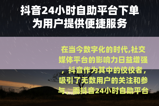 在当今数字化的时代,社交媒体平台的影响力日益增强,抖音作为其中的佼佼者,吸引了无数用户的关注和参与,而抖音24小时自助平台下单的出现,更是为众多用户带来了全新的体验和便利。