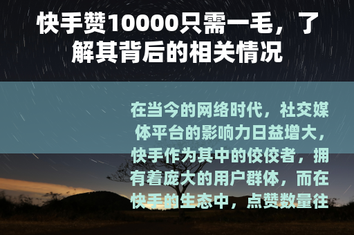 在当今的网络时代,社交媒体平台的影响力日益增大,快手作为其中的佼佼者,拥有着庞大的用户群体,而在快手的生态中,点赞数量往往被视为衡量一个作品受欢迎程度的重要指标之一,有一种说法在网络上流传开来,那就是快手赞10000只需一毛。
