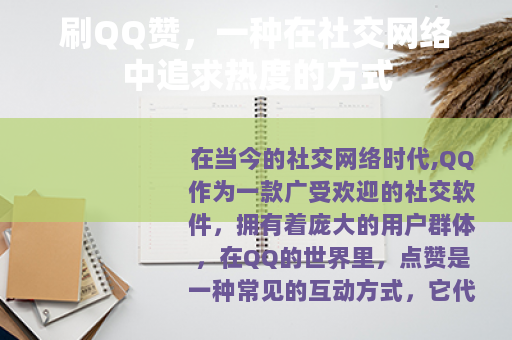 在当今的社交网络时代,QQ作为一款广受欢迎的社交软件,拥有着庞大的用户群体,在QQ的世界里,点赞是一种常见的互动方式,它代表着对他人的认可和喜爱,而刷QQ赞也随之成为了一种现象,不少人希望通过这种方式来提升自己在QQ空间等平台上的人气和关注度。