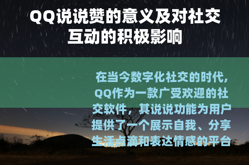 在当今数字化社交的时代,QQ作为一款广受欢迎的社交软件,其说说功能为用户提供了一个展示自我、分享生活点滴和表达情感的平台,而QQ说说赞则成为了这个平台上一个独特而又重要的元素,它有着诸多积极的意义,对社交互动产生了深远的影响。