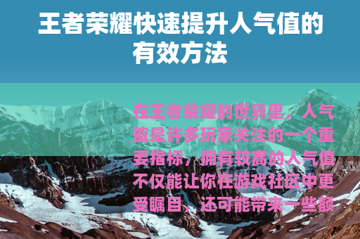 在王者荣耀的世界里,人气值是许多玩家关注的一个重要指标,拥有较高的人气值不仅能让你在游戏社区中更受瞩目,还可能带来一些额外的福利和机会,有哪些方法可以快速提升王者荣耀的人气值呢?以下为大家详细介绍。