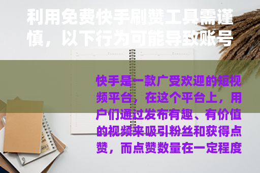 使用免费快手刷赞工具会对我们的账号造成严重的损害,平台的算法是基于用户的真实行为和数据来进行推荐和评估的,当我们使用刷赞工具时,会导致账号的数据异常,平台很容易就能检测到这种异常行为,一旦被平台发现,我们的账号可能会面临限流、降权甚至封禁的处罚,这对于我们在快手上的长期发展来说,无疑是一个沉重的打击。