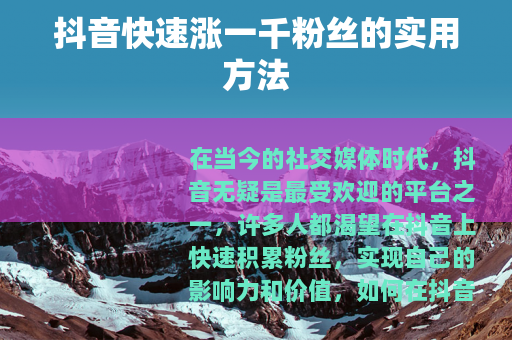通过以上这些方法的持续实践和优化,你就有机会在抖音上快速涨一千粉丝,开启你的抖音之旅,实现自己在抖音平台上的目标和价值,不断学习和尝试新的策略,根据数据分析和用户反馈来调整自己的方法,相信你在抖音上一定能取得不错的成绩。