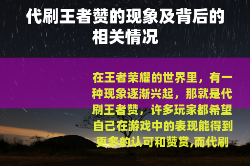 在王者荣耀的世界里,有一种现象逐渐兴起,那就是代刷王者赞,许多玩家都希望自己在游戏中的表现能得到更多的认可和赞赏,而代刷王者赞似乎成为了一种满足这种心理的途径。