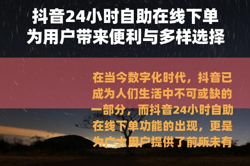 在当今数字化时代,抖音已成为人们生活中不可或缺的一部分,而抖音24小时自助在线下单功能的出现,更是为广大用户提供了前所未有的便利,开启了一种全新的消费体验。